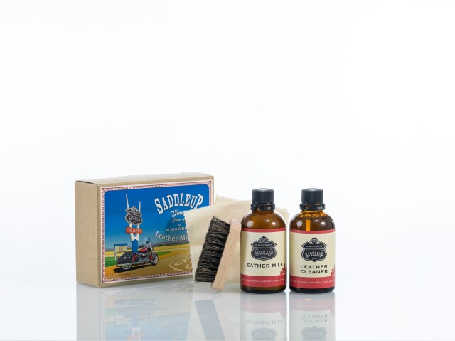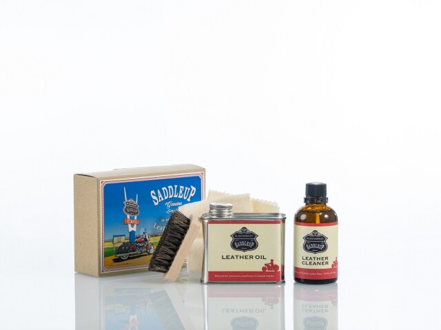 汚れ落としの「サドルアップ レザークリーナー」、保革(栄養)剤、馬毛ブラシ、コットンが入って、こちら1つでお手入れができる内容となっております。
